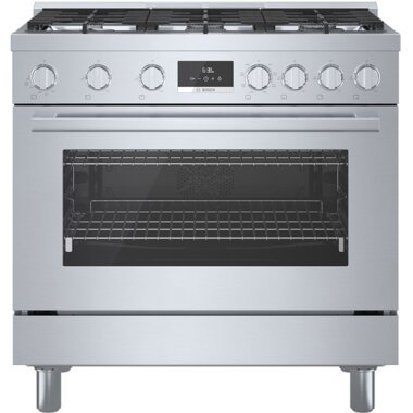 Bosch 800 Series 36″ Industrial Style Freestanding 6-Burner Front Control Dual-Fuel Gas Range In Stainless Steel